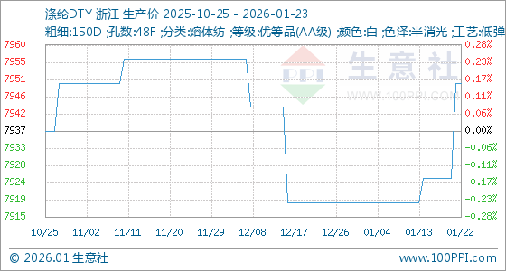 1月23日,生意社涤纶DTY基准价为7950.00元/吨,与本月初(7918.75元/吨)相比,上涨了0.39%。