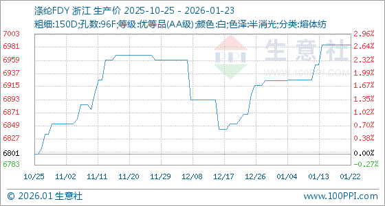 1月23日,生意社涤纶FDY基准价为6985.00元/吨,与本月初(6925.00元/吨)相比,上涨了0.87%。