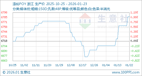 1月23日,生意社涤纶POY基准价为6787.50元/吨,与本月初(6706.25元/吨)相比,上涨了1.21%。