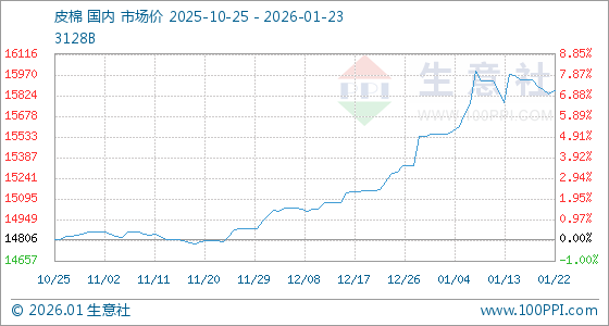1月23日,生意社皮棉基准价为15857.67元/吨,与本月初(15549.17元/吨)相比,上涨了1.98%。