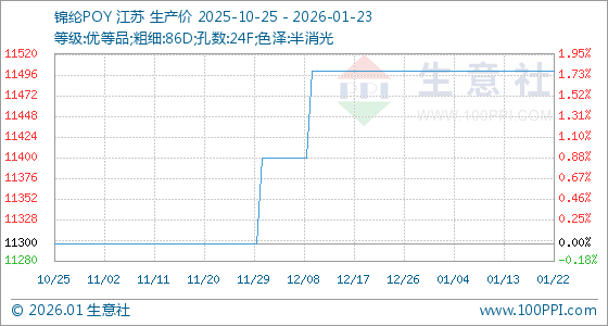 1月23日,生意社锦纶POY基准价为11500.00元/吨,与本月初持平。