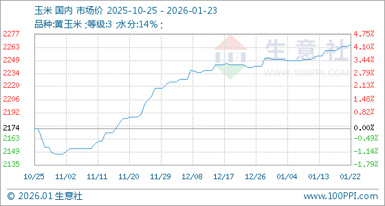 1月23日,生意社玉米基准价为2265.71元/吨,与本月初(2250.00元/吨)相比,上涨了0.70%。