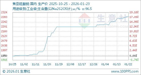 1月23日,生意社焦亚硫酸钠基准价为2290.00元/吨,与本月初(2220.00元/吨)相比,上涨了3.15%。