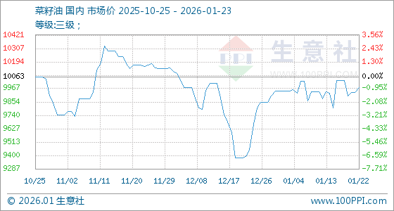 1月23日,生意社菜籽油基准价为9976.00元/吨,与本月初(9948.33元/吨)相比,上涨了0.28%。