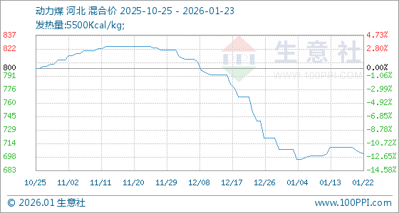 1月23日,生意社动力煤基准价为702.50元/吨,与本月初(707.50元/吨)相比,下降了0.71%。