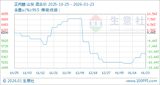 1月23日,生意社正丙醇基准价为5500.00元/吨,与本月初(5200.00元/吨)相比,上涨了5.77%。