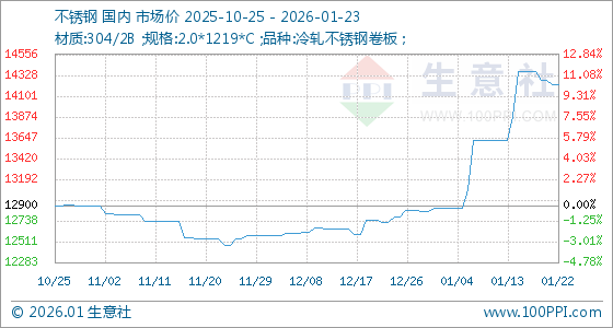 1月23日,生意社不锈钢基准价为14223.33元/吨,与本月初(12873.33元/吨)相比,上涨了10.49%。