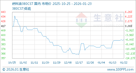 1月23日,生意社燃料油380CST基准价为392.50美元/吨,与本月初(378.50美元/吨)相比,上涨了3.70%。