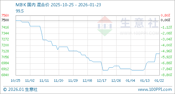 1月23日,生意社MIBK基准价为7100.00元/吨,与本月初(6916.67元/吨)相比,上涨了2.65%。