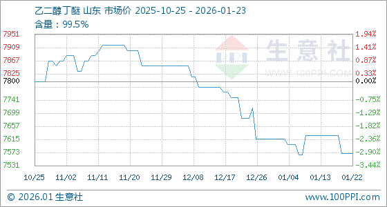 1月23日,生意社乙二醇丁醚基准价为7571.43元/吨,与本月初(7616.67元/吨)相比,下降了0.59%。
