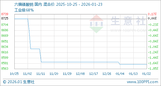 1月23日,生意社六偏磷酸钠基准价为8578.57元/吨 ,与本月初(8585.71元/吨 )相比,下降了0.08%。