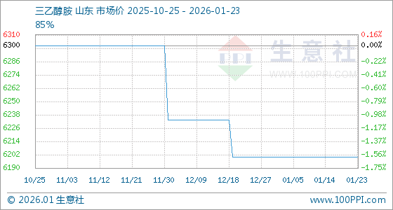 1月23日,生意社三乙醇胺基准价为6200.00元/吨,与本月初持平。