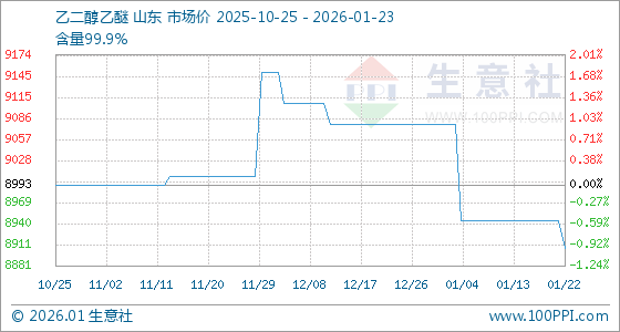 1月23日,生意社乙二醇乙醚基准价为8906.25元/吨,与本月初(9078.57元/吨)相比,下降了1.9%。
