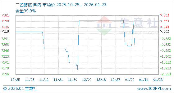 1月23日,生意社二乙醇胺基准价为7268.75元/吨,与本月初(7362.50元/吨)相比,下降了1.27%。