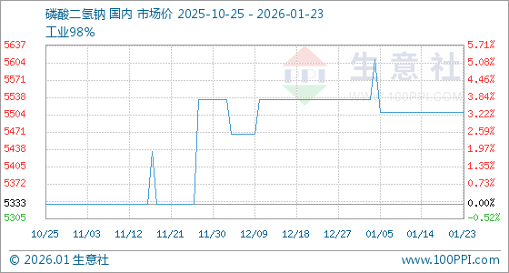1月23日,生意社磷酸二氢钠基准价为5510.00元/吨,与本月初(5533.33元/吨)相比,下降了0.42%。