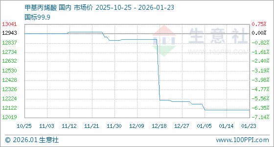 1月23日,生意社甲基丙烯酸基准价为12105.00元/吨,与本月初(12167.50元/吨)相比,下降了0.51%。