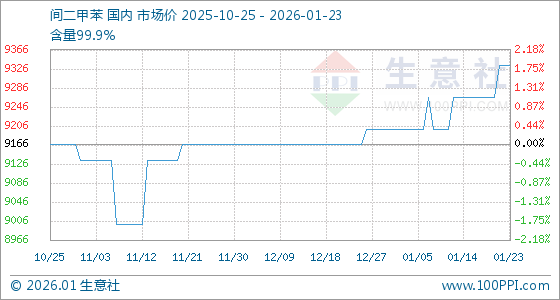 1月23日,生意社间二甲苯基准价为9333.33元/吨,与本月初(9200.00元/吨)相比,上涨了1.45%。