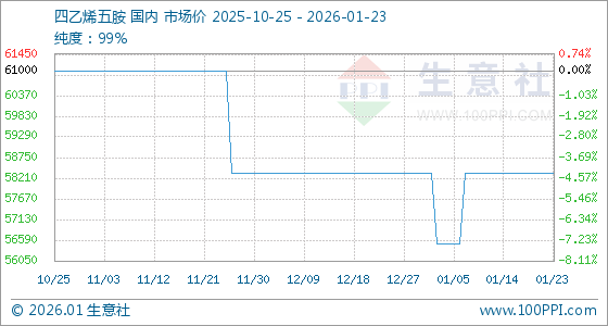 1月23日,生意社四乙烯五胺基准价为58333.33元/吨,与本月初持平。