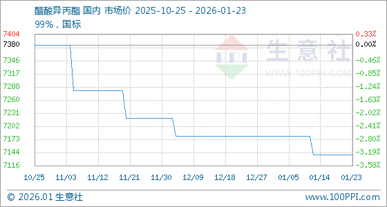 1月23日,生意社醋酸异丙酯基准价为7140.00元/吨,与本月初(7180.00元/吨)相比,下降了0.56%。