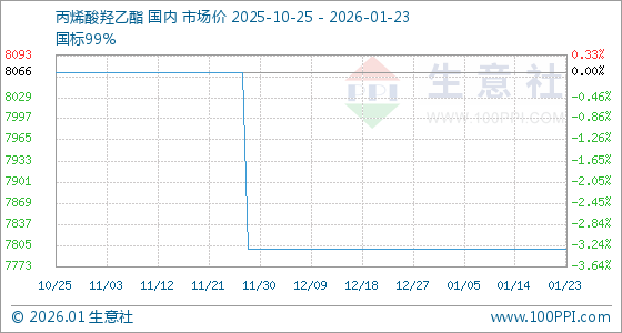 1月23日,生意社丙烯酸羟乙酯基准价为7800.00元/吨,与本月初持平。