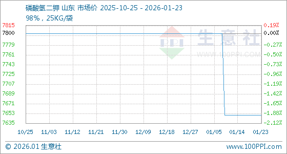 1月23日,生意社磷酸氢二钾基准价为7650.00元/吨,与本月初(7800.00元/吨)相比,下降了1.92%。