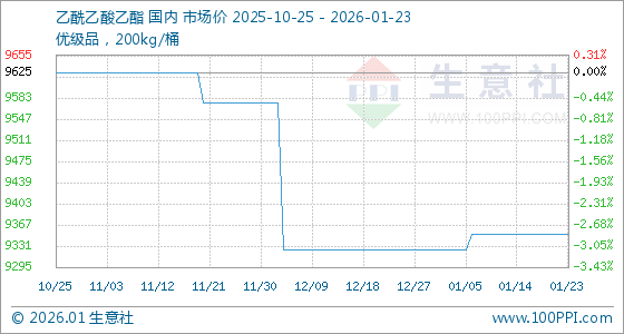 1月23日,生意社乙酰乙酸乙酯基准价为9350.00元/吨,与本月初(9325.00元/吨)相比,上涨了0.27%。