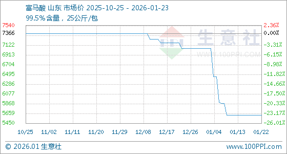 1月23日,生意社富马酸基准价为5625.00元/吨,与本月初(7050.00元/吨)相比,下降了20.21%。