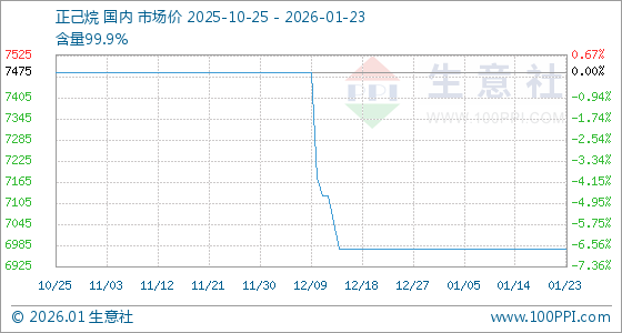 1月23日,生意社正己烷基准价为6975.00元/吨,与本月初持平。