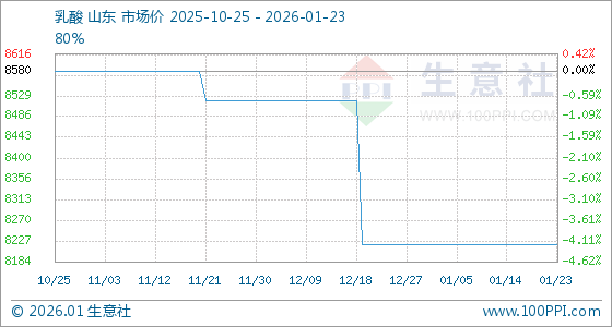 1月23日,生意社乳酸基准价为8220.00元/吨,与本月初持平。