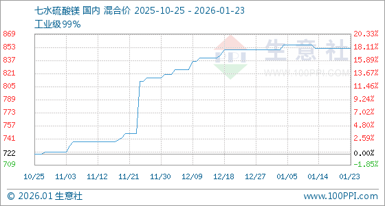 1月23日,生意社七水硫酸镁基准价为852.00元/吨,与本月初(850.00元/吨)相比,上涨了0.24%。