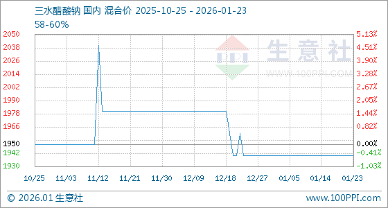 1月23日,生意社三水醋酸钠基准价为1940.00元/吨,与本月初持平。
