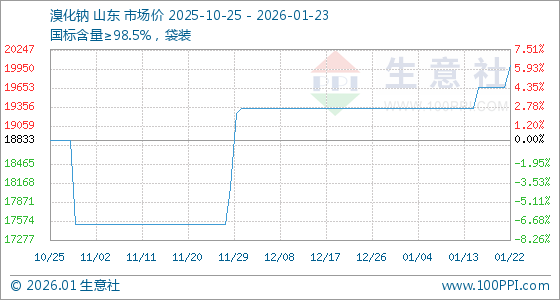1月23日,生意社溴化钠基准价为20000.00元/吨,与本月初(19333.33元/吨)相比,上涨了3.45%。