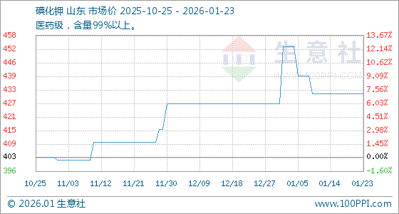 1月23日,生意社碘化钾基准价为432.00元/公斤,与本月初(427.50元/公斤)相比,上涨了1.05%。