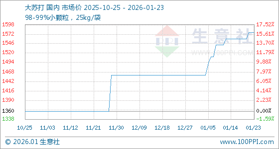 1月23日,生意社大苏打基准价为1576.67元/吨,与本月初(1460.00元/吨)相比,上涨了7.99%。