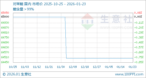 1月23日,生意社对苯醌基准价为64500.00元/吨,与本月初持平。