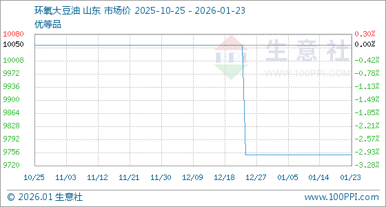 1月23日,生意社环氧大豆油基准价为9750.00元/吨,与本月初持平。