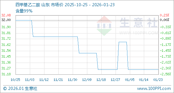1月23日,生意社四甲基乙二胺基准价为31.25元/千克,与本月初(31.67元/千克)相比,下降了1.33%。