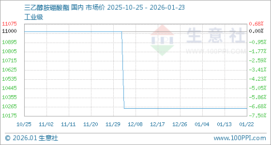 1月23日,生意社三乙醇胺硼酸酯基准价为10250.00元/吨,与本月初持平。