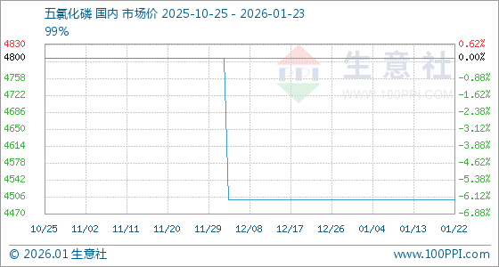 1月23日,生意社五氯化磷基准价为4500.00元/吨,与本月初持平。