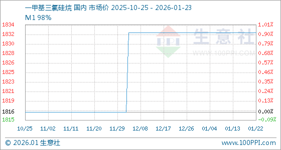 1月23日,生意社一甲基三氯硅烷基准价为1833.33元/吨,与本月初持平。