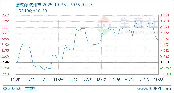 1月23日,生意社螺纹钢基准价为3205.16元/吨,与本月初(3232.00元/吨)相比,下降了0.83%。