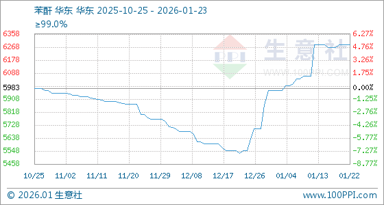 1月23日,生意社苯酐基准价为6283.33元/吨,与本月初(5966.67元/吨)相比,上涨了5.31%。