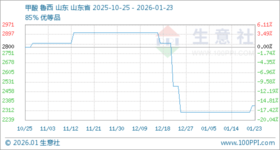 1月23日,生意社甲酸基准价为2350.00元/吨,与本月初(2300.00元/吨)相比,上涨了2.17%。