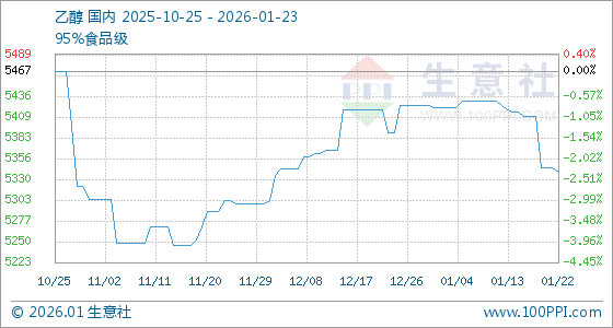 1月23日,生意社乙醇基准价为5338.89元/吨,与本月初(5421.11元/吨)相比,下降了1.52%。