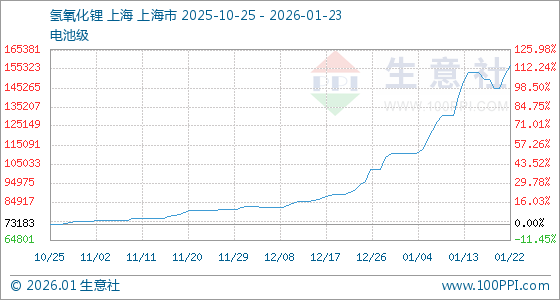 1月23日,生意社氢氧化锂(电池级)基准价为157000.00元/吨,与本月初(110666.67元/吨)相比,上涨了41.87%。