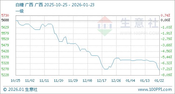 1月23日,生意社白糖基准价为5270.00元/吨,与本月初(5356.67元/吨)相比,下降了1.62%。