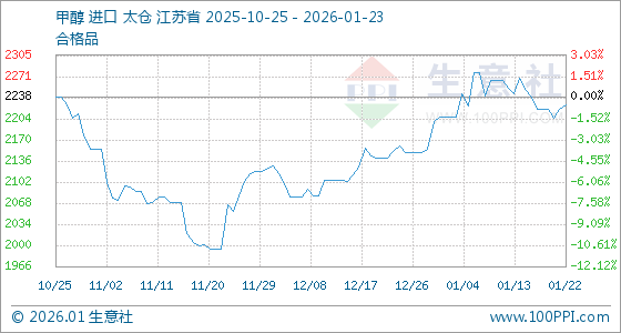 1月23日,生意社甲醇基准价为2225.83元/吨,与本月初(2207.50元/吨)相比,上涨了0.83%。