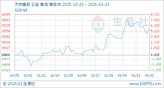1月23日,生意社天然橡胶基准价为15616.67元/吨,与本月初(15341.67元/吨)相比,上涨了1.79%。