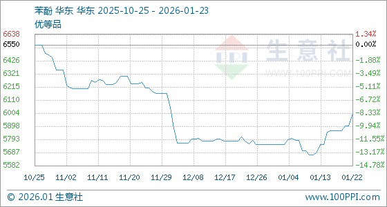 1月23日,生意社苯酚基准价为6000.00元/吨,与本月初(5750.00元/吨)相比,上涨了4.35%。