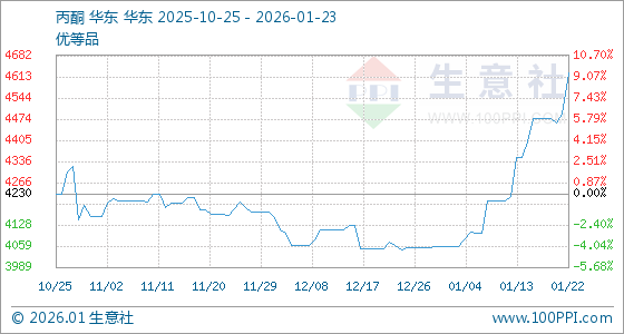 1月23日,生意社丙酮基准价为4625.00元/吨,与本月初(4057.50元/吨)相比,上涨了13.99%。